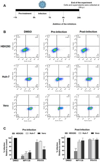 To determine whether deubiquitinating activity is required during the early phase of the replication cycle, inhibitor treatment was initiated either before infection (pre-infection) or 4 h after virus inoculation (post-infection), and viral antigen was detected at 24 hpi (Figure 3A). Cell lines showed different infection profiles; HEK293 cells were infected by 25%, whereas Vero and Huh-7 cells displayed higher infection rates (~80%) (Figure 3B). Treatment with WP1130 before infection significantly decreased infection rates by more than ~70% in all the cell lines (Figure 3C). However, adding the inhibitor after infection only reduced the percentage of infected HEK293T cells. Treatment with PR619 pre- or post-infection did not significantly affect the number of human-infected cells; in contrast, Vero cells showed a considerable reduction in the percentage of CHIKV-positive cells when the inhibitor was added before virus inoculation (Figure 3C). Altogether, these results suggested that deubiquitinating activity is fundamental to CHIKV replication and that DUBs regulate critical events during the early phase of infection.