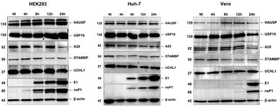 Several studies have shown the overexpression or downregulation of some DUBs during viral infection [26,27,28,29]. To determine whether DUB protein expression was modified during CHIKV infection, a kinetic analysis was performed, and a panel of six proteins was evaluated (Figure 5). Viral proteins (E1 and nsP1) were detectable as early as 4 h post-infection in HEK293 cells, 8 hpi in Huh-7 cells, and 12 hpi for Vero cells. Regarding DUB expression, no apparent differences were found throughout infection in the levels of HAUSP, also called USP7, UCHL1, A20, USP10, STAMBP, and CYLD. Phosphorylated or activated CYLD was not detected.