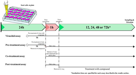 Viral load at different time points with and without treatment was analyzed using ordinary two-way ANOVA with Sidak’s multiple comparison test; qPCR data were normalized into base 10 logarithm, and multiple t-tests with Holm–Sidak’s correction for multiple comparisons were applied. Viral loads in different treatment concentrations were compared using the Kruskall–Wallis test with Dunn’s multiple comparisons test. All values were expressed as mean ± SD from at least three independent experiments, and p < 0.05 was considered significant. All statistical data analyses were performed using GraphPad Prism software (version 6.0; GraphPad software, La Jolla, CA, USA).