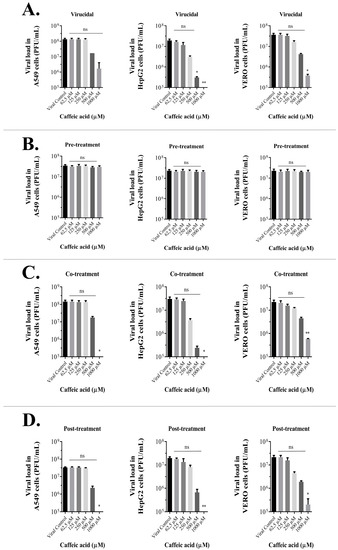 The plaque reduction assay was performed using a modified protocol previously described []. Briefly, A549 or Vero cells were seeded in 24-well plates at a density of approximately 1 × 105 and incubated at 37 °C in a humidified atmosphere containing 5% CO2 for 24 h. For the virucidal assay, a constant challenge of 50 PFU was treated with CA (1000–62.5 µM) in final volumes of 200 µL for 1 h at 37 °C. Then, these volumes were added to the confluent cell monolayers; plates were re-incubated for 1 h and gently shaken every 15 min for viral adsorption. Subsequently, the viral inoculum was removed, and a semi-solid overlay was added. For the co-treatment assay, a constant challenge of 50 PFU was treated with CA (1000–62.5 µM) in final volumes of 200 µL and immediately added to the confluent cell monolayers; plates were re-incubated for 1 h and gently shaken every 15 min for viral adsorption. Subsequently, the viral inoculum was removed, and a semi-solid overlay was added. For the post-treatment assay, 200 µL of the viral inoculum (50 PFU) were added to the confluent cell monolayers; plates were re-incubated for 1 h and gently shaken every 15 min for viral adsorption. Subsequently, the viral inoculum was removed, and a semi-solid overlay containing CA-decreasing concentrations (1000–62.5 µM) was added. For the virucidal, co- or post-treatment assays, control samples consisting of virus-infected untreated or treated cells were also included in each assay. Plates were maintained for three days in a humidified atmosphere containing 5% CO2 with daily observation. After this period, the overlay was removed, and cell monolayers were stained with a crystal violet solution, where non-stained lesions (plaques) were quantified and compared to the viral control. The percentage of viral inhibition was calculated by IP = [1 − (number of test plates/number of control plates)] × 100.
