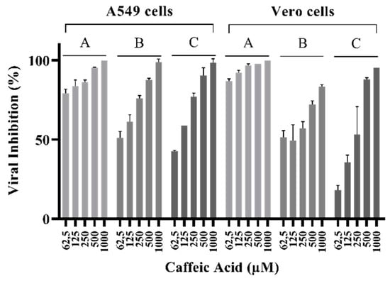 Plaque reduction potential of caffeic acid (62.5–1000 μM) on A549 or Vero cells infected with ILHV at 50 PFU/well. (A) Virucidal assay, incubating ILHV with caffeic acid at 37 °C for 1 h followed by addition to cell culture. (B) Co-treatment assay, simultaneously adding virus and caffeic acid to cell culture. (C) Post-treatment assay, infecting cells by incubation at 37 °C for 1 h followed by removal of virus and addition of caffeic acid post-infection. Viral control corresponds to 0% viral inhibition.