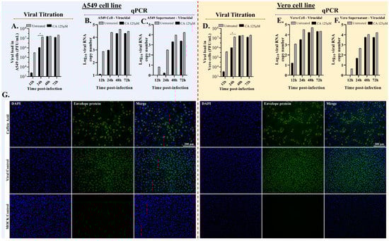 To analyze whether CA directly affects ILHV infectivity, we infected A549, or Vero cells with ILHV (MOI 1) previously incubated for 1 h with 125 µM CA. The viral progeny was quantified by plaque-forming assay and qPCR in cell content and supernatant at the indicated times post-infection. In the assessment of viral RNA load in untreated infected cells and infected cells treated with CA, RNA viral copy numbers decreased by 1.79 log10 in treated A549 cell content (Figure 4B) and by 1.89 log10 in treated Vero cells (Figure 4D), with statistical significance (p < 0.05) at 12 h, and RNA viral copy numbers decreased during 24–72 h without statistical significance. At 12 h and 24 h, treatment with CA determined a decrease of 5.2/2.28 log10 RNA viral copy numbers in A549 cell supernatant (Figure 4C) and 0.48/0.98 log10 in Vero cell supernatant (Figure 4F), respectively, with statistical significance (p < 0.05), and RNA viral copy numbers decreased during 48–72 h without statistical significance. In the untreated infected cells with equivalent dilutions of DMSO without CA, viral titers and viral DNA loads were not inhibited by DMSO compared to the virus control (Figure S5).