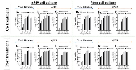 Antiviral activity of caffeic acid against ILHV investigated under different treatment conditions. (A,D,G,J) Culture supernatants were harvested at the indicated times; ILHV production was measured in the presence of 125 µM dilution CA in cells infected with MOI 1 by plaque-forming assay. (B,C,E,F,H,I,K,L) Culture supernatants and cell total RNA were harvested at the indicated time points. ILHV production was measured in the presence of 125 µM dilution of CA in cells infected with MOI 1, using real-time RT-PCR. (A) Viral load in co-treated A549 cells. (B) Viral RNA copy number in co-treated A549 cells content. (C) Viral RNA copy number in supernatant co-treated A549 cells. (D) Viral load in co-treated Vero cells. (E) Viral RNA copy number in co-treated Vero cells content. (F) Viral RNA copy number in supernatant co-treated Vero cells. (G) Viral load in post-treated A549 cells. (H) Viral RNA copy number in post-treated A549 cells content. (I) Viral RNA copy number in supernatant post-treated A549 cells. (J) Viral load in post-treated Vero cells. (K) Viral RNA copy number in post-treated Vero cells content. (I) Viral RNA copy number in supernatant post-treated Vero cells. Degree of significance indicated on the figure as follows: * p < 0.05.