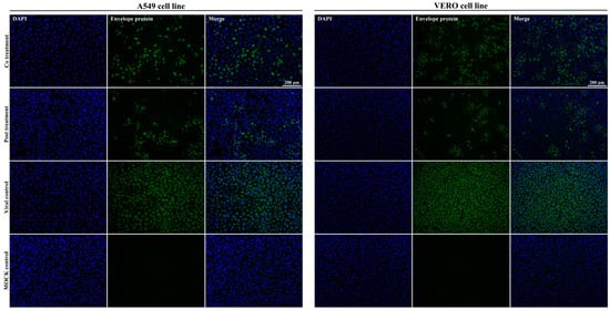 Vero or A549 cells were seeded onto 24-well plates (1 × 105 per well) and incubated at 37 °C with 5% CO2 for 24 h. Cells were infected at MOI of 0.1 of ILHV, washed, and incubated with the compound for 24 h. Cells were washed and fixed in 4% paraformaldehyde, rewashed, and permeabilized with 0.05% Triton X-100 (JT Baker). Cells were blocked in 5% BSA (Sigma-Aldrich, USA) and incubated with an anti-flavivirus group antigen 4G2 antibody. AlexaFluor 488 Rabbit Anti-mouse IgG (Abcam, Waltham, MA, USA) and DAPI were used to stain viral proteins and cell nuclei, respectively.