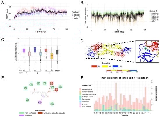 MD and ensemble docking analysis. (A) RMSD behavior throughout the 100 ns trajectory for all replicates. Replicates are shown as transparent colored lines, and the average for the five replicates is represented as a black line. (B) Vina score from caffeic acid docking in each frame for all trajectories. Details of values (mean, max, min, etc.) for RMSD and Vina score are presented in Tables S2 and S3. (C) Box plot of Vina Score distribution. Replicate 3B performed better (lower Vina Score values) than the other replicates/chains. (D) Caffeic acid (green line) binding between DI/DIII domains (red and blue ribbons, respectively). This is a complex retrieved from replica 2, chain A. (E) 2D diagram of interaction of protein-ligand complex from panel (D). This figure was created using Discovery Studios. (F) Main interaction residues of protein E, replicate 2A. Note that most of the residues are interacting in DI (residues 1–51; 132–192; 280–294) and DIII (residues 296–406). The interaction count below 1000 was not plotted. This analysis of the protein–ligand interaction was conducted using the BINANA algorithm and a Python script developed in-house. Analysis of the main interaction residues from all replicates and chains can be seen in Figure S4.