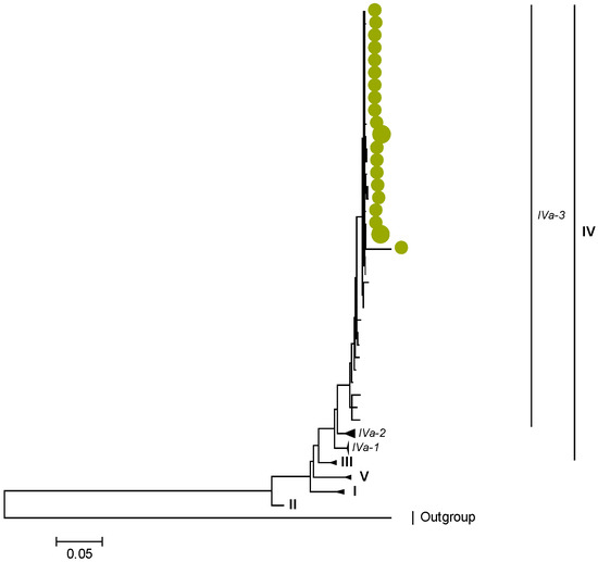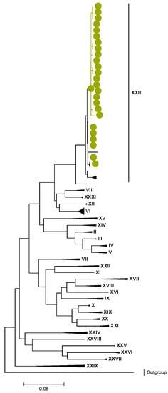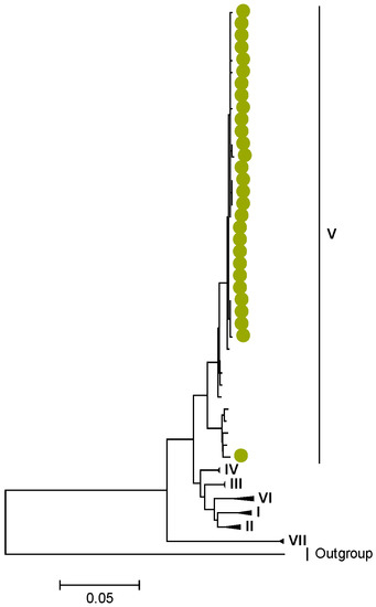 VP7. Maximum Likelihood phylogenetic tree of the genome segment encoding VP7 of Zambian G2P[4] sequences. The study strains are indicated with light-green circular symbols. Lineages are indicated in Roman numerals, while sub-lineages are in italic. The scale number indicates the number of nucleotide substitutions per site.