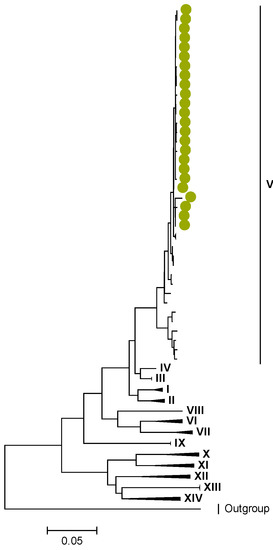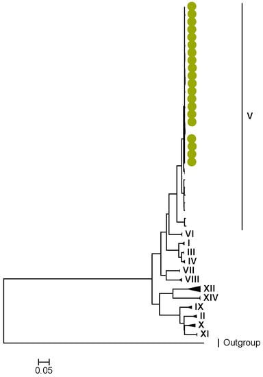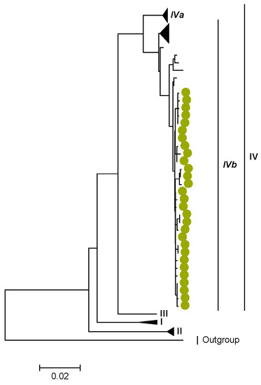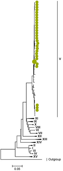 - Tamura, K.; Stecher, G.; Peterson, D.; Filipski, A.; Kumar, S. MEGA6: Molecular evolutionary genetics analysis version 6.0. Mol. Biol. Evol. 2013, 30, 2725–2729. [Google Scholar] [CrossRef]