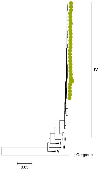 VP1. Maximum Likelihood phylogenetic tree of the genome segment encoding VP1 of Zambian G2P[4] sequences. The study strains are indicated with light-green circular symbols. Lineages are indicated in Roman numerals. The scale number indicates the number of nucleotide substitutions per site.