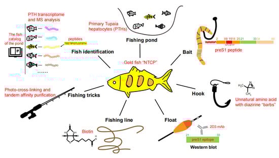 After targeting the fishing pond, preparing proper bait was crucial for successful fishing (Figure 2). Theoretically, the bait for receptor hunting can be designed based on HBV or HDV viral particles or viral components that specifically interact with the unknown receptor. We attempted various preS baits and finally chose the functional myristoylated HBV preS1 peptide as the prototype for bait design. Compared with viral particles or full-length L proteins, the smaller preS1 peptide was considered to be better exposed, easier for modification, and might have lower non-specific binding. Of note, previous studies have tried to use preS1 peptide or preS1 fusion proteins as bait but have failed to identify any functional HBV receptor through conventional immunoprecipitation (IP) methods [13,18,20,23]. Except for using the improper cells for receptor identification, the following possibilities may also have contributed to the failure of many previous attempts for receptor hunting. This includes the insufficient receptor-binding activity of the bait due to the sub-optimal bait design strategy; the expression of the receptor in the target cells could be insufficient; the binding between the peptide and the receptor might not be strong enough; and the virus–receptor interaction might be detergent sensitive. Accordingly, it is crucial to use a receptor binding activity-validated preS1 lipopeptide with a barbed hook to firmly hold the bait-biting fish. Live cell cross-linking can play this role by forming covalent bonds between the preS1 bait peptide and the receptor under physiological conditions, enabling Western blot (WB) detection and highly stringent and tandem purification procedures, regardless of the binding stability and structure integrity of the bait-target proteins complex. By contrast, conventional IP methods cannot achieve similar purification procedures, for which non-specific binding and artificial binding are of great concern.
