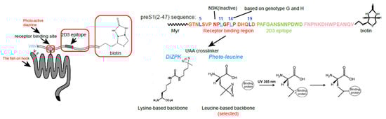 HBV is a small DNA virus with a circular genome of about 3.2 kilobase pairs (kb) that was discovered in 1965 by Dr. Baruch Blumberg [2]. HDV is a satellite virus that uses HBV envelope proteins for viral assembly and cellular entry and, thus, can be employed as an ideal surrogate for studying HBV entry. HBV encodes small (S), middle (M), and large (L) multiple-transmembrane envelope proteins for the formation of outer coats. These proteins share the same S domain sequences as the carboxyl-terminal (C-terminal) region but with different lengths of amino-terminal (N-terminal) sequence extensions named preS1 and preS2, respectively [3]. Previous studies have demonstrated that the N-terminal preS1 domain of the L protein might play a central role in receptor recognition. Mutations in this region abolish viral infectivity, and the synthetic N-terminal myristoylated preS1 peptide encompassing the N-terminal region preS1 sequences specifically binds to the hepatocyte and efficiently blocks the HBV and HDV infection. Fine mapping of the preS1 region has highlighted the importance of the N-terminus lipidation and the N-terminal 2–48 amino acids (aa) for inhibitory activity, especially in the aa9–15 critical regions [4,5,6,7].