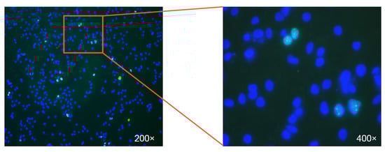 The first view of HDV infection in Huh7-NTCP cells. The image shows the immunostaining of the nuclear-localized HDV delta antigen (green) in HDV infected Huh7 cells expressing human NTCP. The nuclei were stained in blue. The right panel displays an enlarged view of the infected cells.