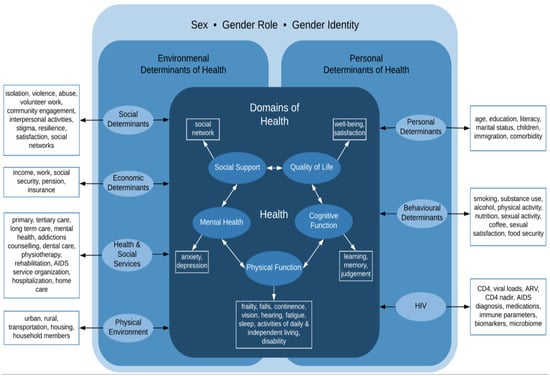 As the life expectancy among persons living with HIV approaches that of the general population, persons living with HIV and their caregivers are facing a whole new set of challenges [4]. What is the experience of aging with HIV? What strategies will support persons living with HIV to age well? In the general population, women tend to live longer but with more comorbidity; will this be the case for women living with HIV? Does the health experience of aging with HIV differ depending on sex and gender identity? Critical knowledge gaps exist on how HIV and its therapies impact and interact with normal aging. Understanding these dynamics is essential for health care professionals, clinics, hospitals, long-term care (LTC) facilities, and AIDS service organizations to anticipate the challenges of aging with HIV. In Canada, the health care system is publicly funded, where universal access to care includes prescription drug coverage for individuals aged 65 years and older, including antiretroviral therapy. Most people living with HIV are receiving care from primary care physicians with expertise in HIV care or specialty HIV clinics. However, there are no geriatric models of care for people living with HIV in Canada across hospital, clinic, and LTC settings to address the complex social and health care needs of this population. The Correlates of Healthy Aging in Geriatric HIV (CHANGE HIV) study is the first Canadian cohort of PLWH aged 65 years and older. The cohort was established in 2019 with the purpose of advancing knowledge in HIV and aging by characterizing the multidimensional health status of persons living with HIV in Canada aged 65 years and older and identifying factors influencing healthy aging. The study design builds on the WHO conceptual framework for Healthy Aging, which aims to comprehensively capture the health status of persons living with HIV (Figure 1) [5]. Health status, the dependent variable in the CHANGE HIV study, is defined by measures from health domains including physical function, cognitive function, mental health, quality of life, and social support (shown in diamonds). These are conceptualized in the context of personal (behavioral and physical) and environmental (economic, social, physical environment, and health services) determinants of health (shown in circles), including HIV-specific factors (immune, viral, therapy, and complications). Each domain and determinant of health is operationalized by several independent variables measured in the cohort (shown in rectangles). We present the cohort profile for the first 353 participants enrolled in the study with a focus on sociodemographic factors, comorbidities, coinfections, frailty, cognitive function, loneliness, and resilience using a sex/gender stratified analysis.