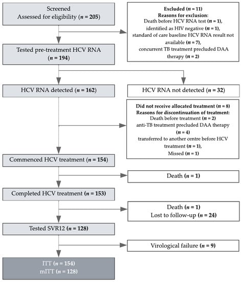 Patient Disposition. HCV: hepatitis C virus; ITT: intention-to-treat; mITT: modified intention-to-treat. The number of participants screened (194/205; 95%), with detectable HCV RNA (162/194; 84%) and who commenced treatment (154/162; 95%) is depicted. Of the 11 patients who were excluded at screening, 7/11 (64%) did not have a standard of care HCV RNA result available at the time of treatment assessment, 2/11 (18%) had concurrent treatment, 1/11 (9%) died prior to HCV RNA testing, and 1/11 (9%) was identified as HIV-negative. Among those 8/162 (5%) who did not commence treatment, 2/8 (25%) died before treatment, 4/8 (50%) were receiving anti-TB treatment precluding DAA therapy, 1 was transferred to another centre before treatment and 1 missed the treatment. One death occurred during treatment due to hepatic decompensation. This participant had underlying cirrhosis and died 15 weeks after commencing therapy.