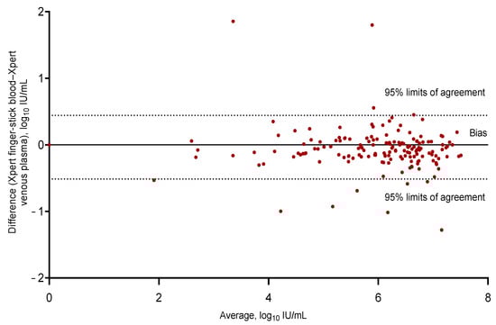 The sensitivity and specificity of HCV RNA on the GeneXpert machine using capillary blood collected via fingerstick was compared using the standard of care HCV RNA plasma testing as the gold standard. This included both positive and negative samples at screening, following the completion of treatment among the participants who were enrolled in this study. Any discordant results were included in all calculations of the sensitivity and specificity. Bland–Altman difference plots were generated to assess the bias and agreement measurements, including the limits of agreement between the quantification of HCV by the Xpert HCV VL Fingerstick Assay compared to the standard of care. The data were analysed with GraphPad Prism (version 7.03).