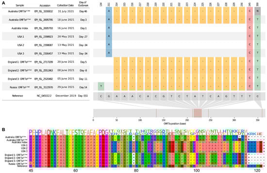 Visualisation of a 17-nucleotide deletion in ORF7a of Delta variant SARS-CoV-2 sequences (ORF7aΔ17del) and the corresponding consequences at the peptide level. Sequences chosen for visualisation include an index case of the Australian Delta outbreak (lacking ORF7aΔ17del), the first Australian case that possessed ORF7aΔ17del during the outbreak period, an Australian sample from ~1.5 months into the outbreak that possessed ORF7aΔ17del, three USA samples (which all lacked ORF7aΔ17del) that match the Australian index case, and a selection of four non-Australian samples that possessed ORF7aΔ17del, some of which were collected before the Australian outbreak had begun. (A) Sample dates of all chosen samples relative to the index case of the Australian Delta outbreak (16 June 2021) and all variants in the sample genomes relative to the SARS-CoV-2 reference genome (created, in part, by using a modified version of snipit, https://github.com/aineniamh/snipit, accessed on 16 August 2021). (B) The consequences of ORF7aΔ17del on the amino acid translation of ORF7a, leading to a premature stop codon after amino acid 78 and a truncated peptide sequence (~64% complete). Amino acids 1–44 were identical to the SARS-CoV-2 reference genome in all samples and are not presented. The figure is adapted from [7].