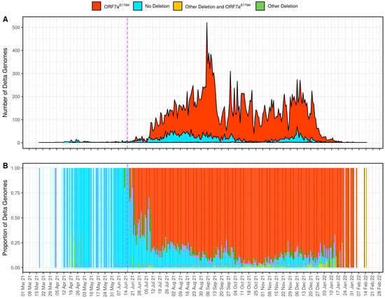 Time series plots of 32,048 genome sequences from the Australian Delta outbreak which show the number (A) and proportion (B) of genomes per day that possessed the characteristic deletion of 17 nucleotides within ORF7a spanning genomic positions 27607–27623 (ORF7aΔ17del), any other deletion in ORF7a, any other deletion in ORF7a plus ORF7aΔ17del, or no deletion in ORF7a. The purple dashed line indicates the beginning of the Australian Delta outbreak. Accession numbers for all the samples that were analysed for this panel are available in Table S1 and https://doi.org/10.55876/gis8.220809bs.