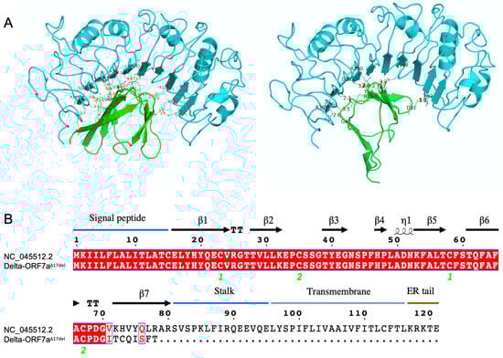The estimated structure of the ORF7a protein in SARS-CoV-2 and the consequences of a deletion of 17 nucleotides within ORF7a spanning genomic positions 27607–27623 (ORF7aΔ17del) on this structure. (A) The ORF7a protein from the Wuhan-Hu-1 reference genome (PDB ID: 7CI3, green) docking with human CD14 (PDB ID: 4GLP, turquoise), as modelled using HDOCK [18]. (B) The inferred peptide sequence of the ORF7a protein in SARS-CoV-2 which demonstrated the peptide and structural changes within the Delta-ORF7aΔ17del variant. The ORF7aΔ17del deletion occurred after the 6th beta sheet in Delta-ORF7aΔ17del, which led to 7 novel amino acids, followed by a stop codon, and caused the loss of the 7th beta sheet, the C-terminal transmembrane domain, and the cytoplasmic di-lysine motif (KRKTE) that determines ER localisation. The alignment was created using Esprit 3.0 [16].