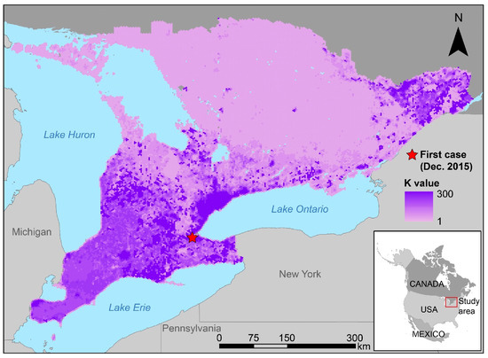 Figure 1. Map of the study area of Southern Ontario with K values shown with the location of the first detected raccoon rabies case. K values represented the predicted number of raccoons sustained by the habitat in each 10-km2 grid cell. A red star denotes the location of the first detected case of raccoon rabies in December 2015. The red square in the inset map denotes the study area.