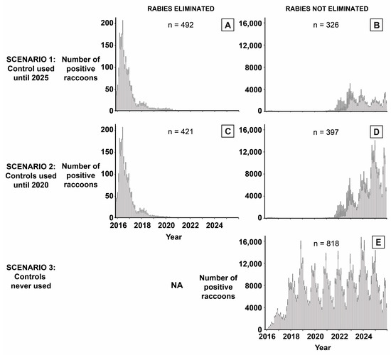 Figure 2. Epicurves showing the predicted median number of new infections of raccoon rabies per month for Scenarios 1, 2, and 3. Median case numbers (grey bars) are shown from November 2015 to December 2025 with upper and lower quartiles (dark lines). Panels (A,C) summarize simulations predicting rabies elimination in Scenarios 1 and 2, respectively, and (B,D,E) summarize simulations predicting rabies was not eliminated in Scenarios 1, 2, and 3, respectively. The number of simulations summarized per epicurve is shown above each panel. For Scenario 3, rabies was only predicted to be eliminated when the disease died off naturally within the first week following its introduction. Therefore, the epicurve for those simulations was not shown. Due to the scale of the y-axis, cases between November 2015 and December 2020 are not visible.