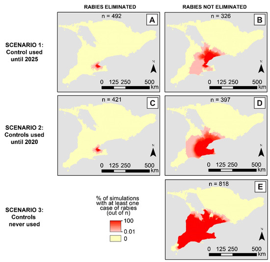 Figure 3. Maps showing the percentage (%) of simulations that predicted at least one raccoon rabies case per 10-km2 grid cell between November 2015 and December 2025. Panels (A,C) summarize simulations predicting rabies elimination in Scenarios 1 and 2, respectively, where simulations with rabies die off in the first week were removed (n = 182). Panels (B,D,E) summarize simulations predicting rabies was not eliminated in Scenarios 1, 2, and 3, respectively. The number of simulations used to calculate percentages per map is shown above each panel. For Scenario 3, rabies was only predicted to be eliminated when the disease died off naturally within the first week following its introduction. Therefore, the map for those simulations was not shown.