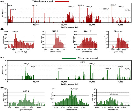 Determination of transcription start sites (TSS) in the FAdV-4 genome. RNA was extracted from FAdV-4-infected chicken LMH cells and subjected to nanopore PCR-cDNA sequencing. Reads originated from the genomes of host cells and were filtered. The remaining full-length cDNA sequences were corrected using Illumina RNA-seq data as the reference and then mapped to the FAdV-4 genome (GenBank MG547384). The resulting sequence alignment/map (SAM) file was processed by a previously published Perl script (classify_transcripts_and_polya_segmented.pl). The start site of each read was collected and expressed as the copy number of reads at each FAdV-4 genome position. (A) Read-start sites on the forward strand of the whole virus genome. (B) The read-start sites in some representative regions on the forward strand were shown at single-nucleotide resolution. (C) Read-start sites on the reverse strand of the whole virus genome. (D) The read-start sites in some representative regions on the reverse strand were shown at single-nucleotide resolution.