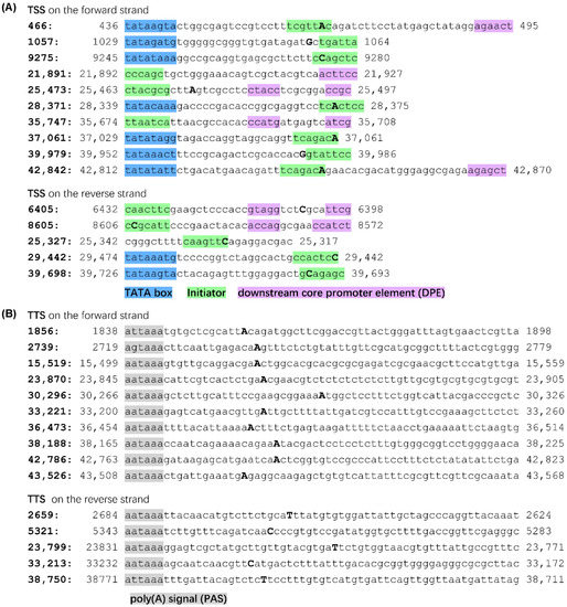 Verification of the found transcription start or termination sites by bioinformatic analysis. (A) The sequence around a TSS (201 bp in length) was copied and analyzed by the core promoter element detection program ElemeNT (https://www.juven-gershonlab.org/resources/element/, accessed on 7 December 2022). The elements found were annotated if they helped explain the adjacent TSS. The positions of major TSS in the FAdV-4 genome (GenBank MG547384) were given at the beginning of each line, and the nucleotide at the TSS were shown in bold uppercase in the sequence. (B) Polyadenylation signals (PAS) were searched and highlighted 10–30 bp upstream of the major transcription termination sites (TTS) inferred from Nanopore cDNA sequencing. The positions of these TTS were given at the beginning of each line, and the nucleotide at the TTS were shown in bold uppercase in the sequence.