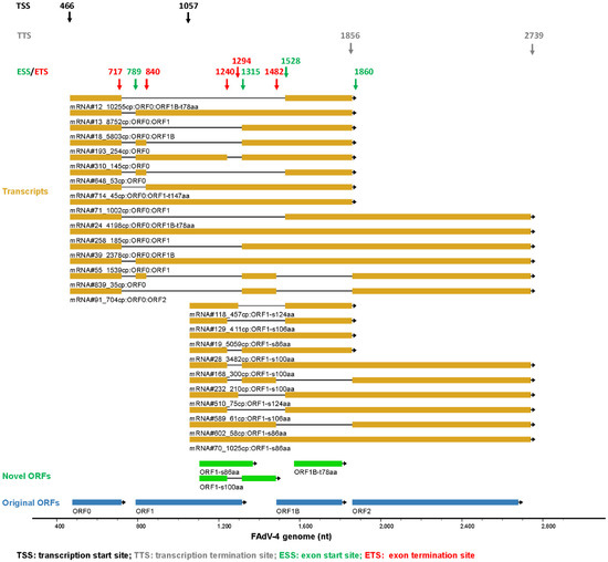 The splicing of FAdV mRNA was complicated. The transcripts of genus-specific genes at the left end of the genome on the forward strand were analyzed and exemplified. There were 1119 transcripts that started and terminated in this region. If the TSS and TTS were confined to the major ones (466-, 1057-nt and 1856-, 2739-nt) and the copy numbers were confined to greater than 30 copies, 24 transcripts could be extracted. As shown in Figure 4, besides TSS and TTS, nine splicing sites were found in this region, including four exon start sites (ESS) and five exon termination sites (ETS). Assembly of different exons generated transcript variants, which served as the translation templates for different proteins. Among the selected 24 transcripts, 20 were spliced mRNAs and held a proportion of 84.4% in copy number.