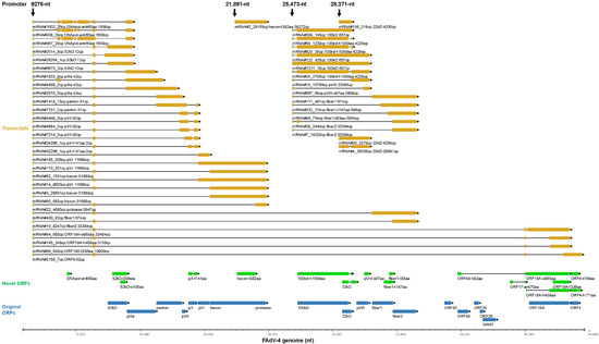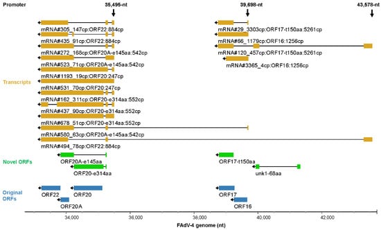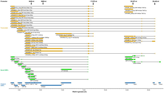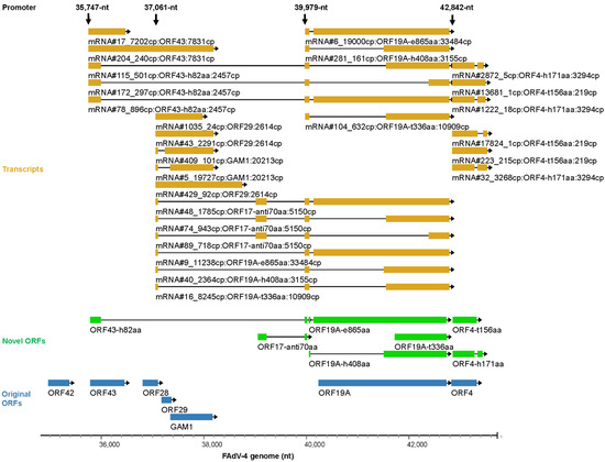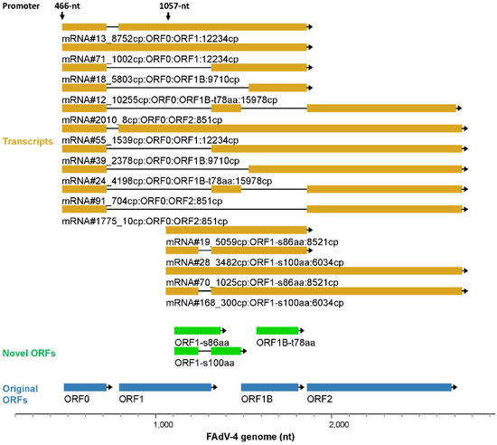 In the above subsections, we described the transcription of FAdV-4 genome from the aspect of promoters. Some transcripts, the key mRNAs encoding low-abundance ORFs, were neglected because they were not driven by the 18 major promoters. If we showed the major transcripts from the aspect of the encoded ORFs, it could be helpful to understand the outline of FAdV-4 transcriptome. The most abundant transcripts for the selected 81 ORFs were illustrated in Figure 10. Some conclusions could be drawn from this transcription map. First, most of the transcripts were spliced mRNAs. Second, generally, a promoter controlled the transcription of a group of adjacent genes. Third, although the activity of a promoter could reach a distance very far from the TSS, it became weak there and another promoter would often engage in and improve the transcription of local genes. Fourth, some important virus genes, e.g., pTP and DNApol, were transcribed in low abundance by weak promoters, and some, e.g., ORF24, ORF20A and unk2-141aa, were not discussed in the above promoter subsection. Finally, novel ORF variants were mostly higher in abundance than the corresponding ORFs annotated previously, suggesting more important roles of novel ORF-encoding transcripts in the life cycle of FAdV-4.
