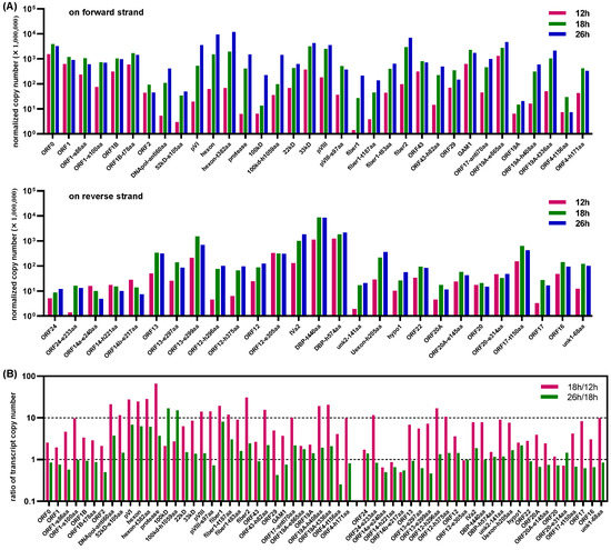 Transcription of FAdV-4 ORFs in LMH cells at 12, 18 and 26 h post virus infection. Virus ORFs with the combined copy number greater than 100 were selected for transcript abundance analysis at different time points post infection. The copy number of each selected viral ORF was normalized by that of total detected transcripts (including those from cells and from viruses, Table S1) at every time points. (A) Transcription of viral ORFs on the forward or the reverse strands at 12, 18 and 26 h post virus infection. (B) Change of the transcription intensity for viral ORFs during virus replication.
