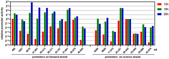 The results from the one-step growth curve showed that FAdV-4 had an average life cycle of 30 h in chicken LMH cells [27]. At the early phase of 12 h, the promoters of forward 466-nt, 37,061-nt, 39,979-nt and reverse 25,327-nt, 29,442-nt had remarkable activity. The key transcripts they produced encoded proteins of ORF0/ORF1, GAM1, ORF19A-e865aa, DBP-t440aa and DBP-h574aa, respectively (Figure 11). At the late phase of 18 or 26 h, all the major promoters except forward 466-nt, 39,979-nt and reverse 29,442-nt, 35,495-nt enhanced their transcription activity. The promoters of forward 28,371-nt and 37,061-nt and reverse 25,327-nt maintained their activity at a high level from 18 to 26 h. The three forward promoters, 9275-nt, 21,891-nt and 25,473-nt, which controlled the transcription of genus-common genes on the forward strand except for 22 kD and 33 kD, even kept increasing their transcription capability from 18 to 26 h (Figure 12).