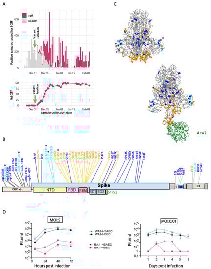 At the beginning of December 2021, we first detected the presence of the Omicron-BA.1 variant in Seattle using the S-gene target failure (SGTF) PCR assay (Figure 2A), following the tail of the delta variant infections. We isolated and sequenced the Omicron-BA.1 variant from these SGTF-identified early cases. By mid-December 2021, the Omicron-BA.1 variant became predominant (Figure 2A, lower). The dominant Seattle Omicron-BA.1 variant is highly similar to the Omicron-BA.1 first reported from South Africa [], with an additional R346K substitution and four small deletions (Figure 2B). Implementation of 3D modeling of the BA.1 spike protein and spike protein binding to ACE2 placed aa changes in the context of spike protein structure (Figure 2C).