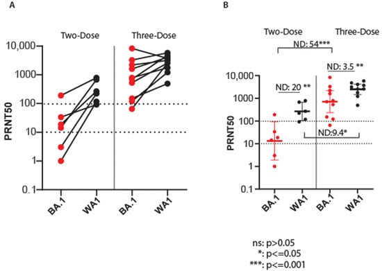 We evaluated the efficacy of two- and three-dose vaccination regimens against Omicron-BA.1 in SARS-CoV-2-naïve persons. We conducted paired PRNT50 analyses of sera collected from vaccine recipient cohorts who had the two-dose vaccination, a median of 153 days, or the three-dose vaccination at a median of 32 days after the third vaccine dose (Table 3). This timeline links closely to the emergence of the Omicron-BA.1 variant and the approval for use of the vaccine booster. As shown in Figure 4A, PRNT50 values in persons receiving the two-dose vaccine regimen were consistently lower against Omicron-BA.1 compared to the ancestral virus. In contrast, sera from a three-dose regimen exhibited an increase in PRNT50 against both Omicron-BA.1 and ancestral viruses. Evaluation of mean PRNT50 levels revealed an ND of 20 with the two-dose vaccination. In contrast, vaccination with a three-dose regimen demonstrated enhanced neutralization of BA.1 to nearly completely overlapping levels with ancestral virus neutralization. Remarkably, the ND value of this comparison was reduced to 3.5 compared to ND 20 for a two-dose vaccine regimen (Figure 4B). Comparison of a three-dose to a two-dose vaccine regimen for each virus alone revealed a major enhancement of BA.1 neutralization (ND = 54) over enhancement of ancestral virus neutralization (ND = 9.4) and demonstrated that neutralization of each isolate was significantly improved by the three-dose vaccination.