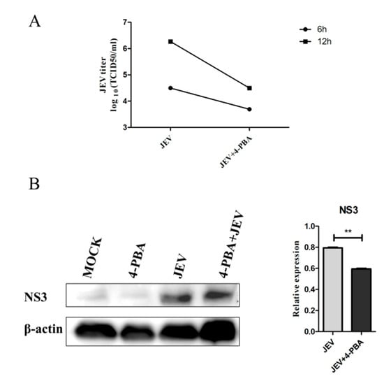 To investigate the effects of 4-PBA on JEV RNA replication, we detected the titer of JEV in BV-2 cells. The results showed that 4-PBA could significantly reduce the titer of JEV in BV2 cells at 6 hpi and 12 hpi (Figure 1A). The western blot results also showed that 4-PBA could significantly inhibit the expression of the JEV NS3 protein (GeneTex, Irvine, CA, USA) (Figure 1B).