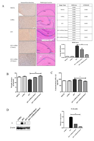 Mice were intracranially injected with JEV at a titer of 106.5 TCID50 and then treated with the 4-PBA by intraperitoneal injection at a dose of 80 mg/kg. The sagittal plane of the mouse brains was collected for pathological section, immunohistochemistry and western blot. The results showed that 4-PBA treatment could significantly inhibit JEV titers, and the inhibition effect was positively correlated with the number of treatments (Figure 2A,D). In addition, 4-PBA treatment can significantly restore the body weight and brain structure damage of JEV-infected mice (Figure 2A,B). Pathological section results show that after JEV infection, the brain tissue structure is moderately abnormal, some neurons disappear, a large number of neurons in CA1 area degenerate, neurons can see fiber tangles and the number of glial cells becomes more. After 4-PBA treatment, brain tissue structure was slightly abnormal, individual nerve cells in the CA1 area degenerated and glial cells increased slightly. The serum IL-1β (Enzyme-linked Biotechnology Co., Ltd., Shanghai, China) level of JEV-infected mice was inhibited by 4-PBA treatment (Figure 2C).