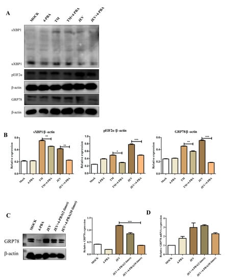 4-PBA inhibits JEV-induced activation of the IRE1 and PERK pathways. (A) The protein levels of GRP78, pEIF2α, sXBP1 (Abcam, Cambridge, UK) were determined using western blot. (B) Densitometry scans of the GRP78, pEIF2α and sXBP1 band in (A). (C) We have confirmed that 4-PBA can inhibit the expression of GRP78 mRNA and protein (D) in brain tissue. * p < 0.05; ** p < 0.01; *** p < 0.001.