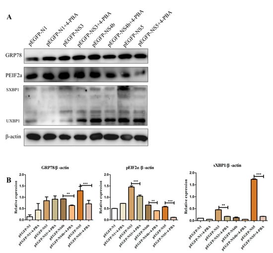 In this experiment, we selected the most obvious JEV non-structural protein that can induce the endoplasmic reticulum stress response of BV2 cells for detection (provided by additional materials). The recombinant plasmid NS3, NS4b and NS5 were transfected into BV2 cells. Four hours after transfection, the control group without 4-PBA of 1 mM/mL and the treatment group were set, respectively. Compared to that in the untreated cells, the levels of GRP78, sXBP1 and pEIF2α in NS4b and NS5 transfected cells treated with 4-PBA reduced, but that in NS3 transfection cells showed a non-significant difference of GRP78 (Figure 4A,B). 4-PBA inhibits the non-structural protein of JEV to activate ERS through the PERK and IRE1 pathways.