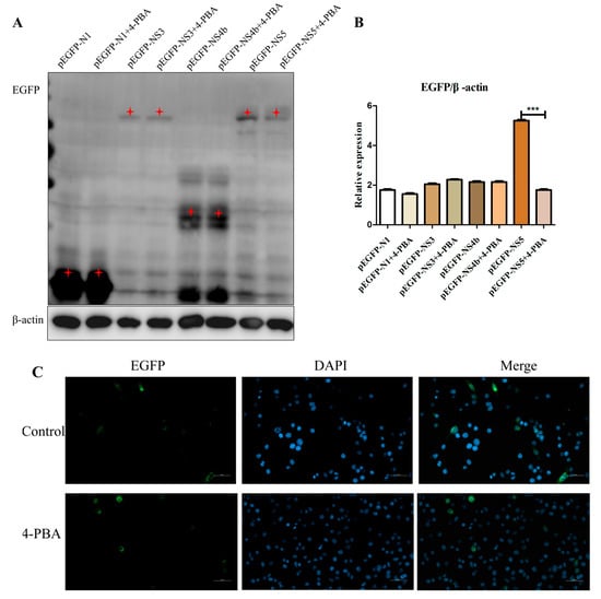 4-PBA inhibits NS5 expression in vitro. (A,B) Effect of 4-PBA on the expression of NS3, NS4b and NS5 proteins. (C) Laser confocal microscope detected NS5 gene expression. The red star is the correct size of protein. *** p < 0.001.