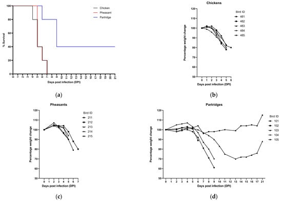 Weight changes and survival plots of chickens, pheasants and partridges infected with APMV-1/chicken/Bulgaria/112/13. (a) Survival kinetics of directly infected birds, chickens (black line), pheasants (red line) and partridges (blue line) following infection with APMV-1/chicken/Bulgaria/112/13. Weight changes as a percentage of their starting weights of (b) chickens, (c) pheasants and (d) partridges not selected for postmortem examination. Mortalities were determined for birds that were found dead or required humane killing on welfare grounds.