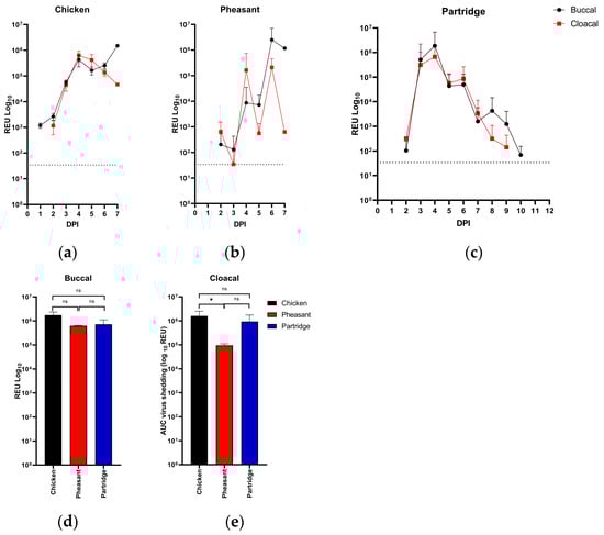 To compare total shedding between species, area under the curve (AUC) analysis was carried out (Figure 2d,e). The analysis showed that there was a significant difference in shedding between chickens and pheasant via the cloacal route (p = 0.027), but no significant differences were observed elsewhere.