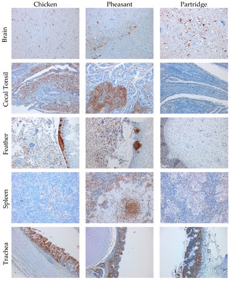 Representative immunohistochemical staining of chicken (4 dpi), pheasant (4 dpi) and partridge (9 dpi) tissues for AOAV-1 antigen following infection with APMV-1/chicken/Bulgaria/112/13.