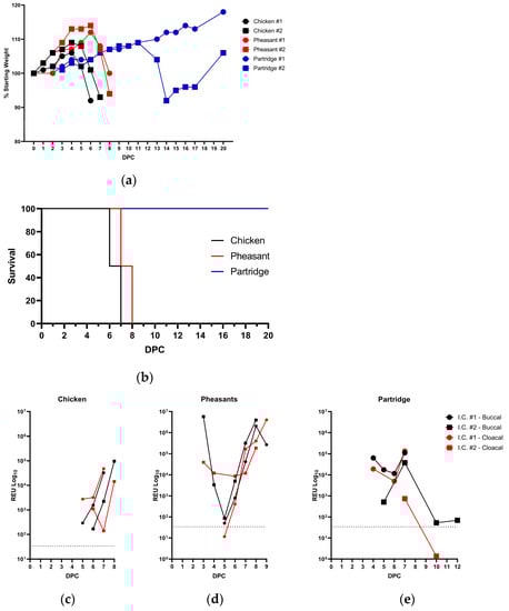 Weight changes, survival plots and viral RNA shedding of in-contact chickens, pheasants and partridges. Weight changes (a) as a percentage of their starting weights and survival kinetics (b) of in-contact chickens (black), pheasants (red) and partridges (blue). Mortalities were determined for birds that were found dead or required humane killing on welfare grounds. Buccal (black), or cloacal (red) viral RNA shedding of the in-contact chickens (c), pheasants (d) and partridges (e) expressed as relative expressed units (REU) and the dotted horizontal line showing limit of detection.