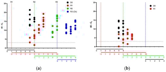 The analysis of the transmission within pheasants demonstrated that at 4 dpi, all six of the D0 pheasants had been successfully infected and were shedding vRNA. Examination of transmission in the R1 birds demonstrated transmission had occurred to two pheasants at 4 dpc, and to all six pheasants by 5 dpc (Figure 5a). Onward transmission to the R2 pheasants occurred by 4 dpc of R1 pheasants (n = 5) and to all six birds by 5 dpc (11 days since the D0 inoculation). The introduction of chickens (R3) continued the transmission with all six chickens shedding vRNA within 2 days of contact of the R2 pheasants (13 days since inoculation of D0 pheasants).