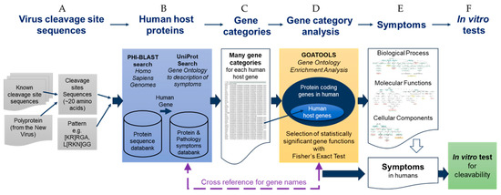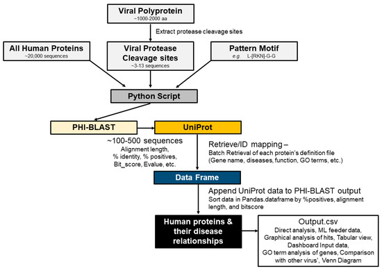 To accelerate the analysis of the viral protease cleavage sites in human proteins, we developed a sequence-to-symptom tool, automating the search and pairing process. We used the viral polyprotein sequences, PHI-BLAST, the UniProt database for gene ontologies, protein functions, and disease relationships, as well as gene ontology enrichment analysis tools (Figure 1). We packaged all this using Python programming language, and we refer to it as a “sequence-to-symptom” tool. The lists that were generated were grouped in Venn diagrams and are available in the Supplementary Materials, Tables S1–S3).