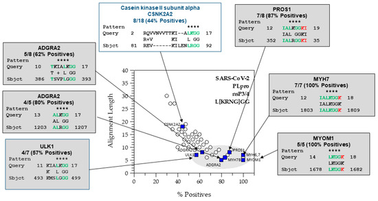 The SARS-CoV-2 PLpro PHI-BLAST hits using a 2D graph of alignment length vs. percent positives. Astrisks show the match to the PHI-BLAST pattern. In green are the residues N-terminal to the scissile bond and in red are the residues C-terminal to the scissile bond that match a viral protease cleavage site sequence. The Python script will generate the most probable host targets based upon subsite tolerances extracted from known cleavage sites (e.g., L[KRNG]GG] for the PLproSARS2). The 2D graph shows a cluster capturing hits with protease cleavage sites and relationships to pathology such as the anti-coagulant protein, PROS1, VWF (overlapped with ADGRA2 at 62.5%, 8), the cardiac myosins (MYH7, MYH6), and sarcomeric protein, MYOM1. The alignments in the upper left are potentially cleavable, but have gaps and shorter runs of matching residues.