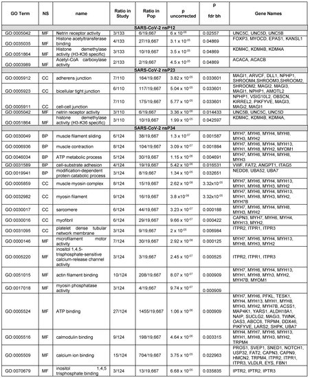GOATOOL results of the hits from SARS-CoV-2 PLpro nsP1/2 (SGVTRELMRELNGG↓AYTRYV), nsP2/3 (NMMVTNNTFTLKGG*↓APTKVT) and nsP3/4 (VVNVVTTKIALKGG↓KIVNNW) junctional cleavage sites PHI-BLAST searches.