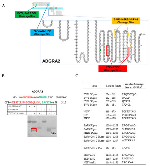 ADGRA2 (GPR124) is a common predicted hit among neuroinvasive viruses. (A) ADGRA2 (GPR124) is a G-protein coupled receptor; the regions predicted to be in the cytoplasm by Protter [42] contain many of the predicted cleavage sites. (B) A substrate (10 µM) containing one of the two predicted cleavage sites in ADGRA2 for the VEEV nsP2 cysteine protease (5 µM) was cleavable. Cleavage products are boxed in red. The (+) signs indicate which enzymes, inhibitors, or substrates were present in the reaction for the lane in the gel. The V12 substrate (10 µM) contains the natural nsP1/2 cleavage site; this substrate is cut to completion in the 24 h room temperature (23 ± 3 °C) incubation by the VEEV nsP2 cysteine protease (5 µM). Whereas, the cyan-yellow fluorescent protein (CFP-YFP) containing the predicted ADGRA2 cleavage site was more slowly cut during the same incubation period. (C) Locations of the predicted viral protease cleavage sites in the ADGRA2 human sequence. Some sites are extracellular, while others are intracellular. Asterisks indicate the scissile bond.