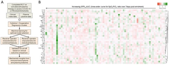 Systemic cytokine deluge associated with the hyper-inflammatory state encountered in severe COVID-19 is established as the therapeutic target, and anti-inflammatory corticosteroids have been by far the most successful pharmacotherapy. Targeting individual cytokines such as IL-6 has also been productive, but only in patient subsets [15,16,17]. Targeting cytokines, either as disease biomarkers or therapeutic targets, is limited by the well-documented heterogeneity in the composition of the cytokine deluge in severe COVID-19 [7,22]. To identify cytokines with the most generalized influence on COVID-19 disease outcomes, we attempted a retrospective analysis, powered by machine learning algorithms, on clinical metadata and plasma cytokine concentration data derived from a concluded RCT on CPT, performed in a small Indian cohort of severe COVID-19 patients [22]. The cohort characteristics are depicted in Supplemental Table S1. The design of the study is depicted in Figure 1A. Plasma levels of 36 different cytokines (sampled at ARDS diagnosis, <7 days post-hospitalization) were taken as features to describe the tissue response of the patients in terms of blood oxygenation over 7 days post-sampling, taking the area under curve for the kinetics of SpO2/FiO2 ratio as a quantitative surrogate (termed SFR7dAUC). The higher the SFR7dAUC value, the better the blood oxygenation over 7 days [22]. Figure 1B shows the heterogeneity of cytokines clusters based on plasma concentrations in different patients with varying levels of SFR7dAUC.