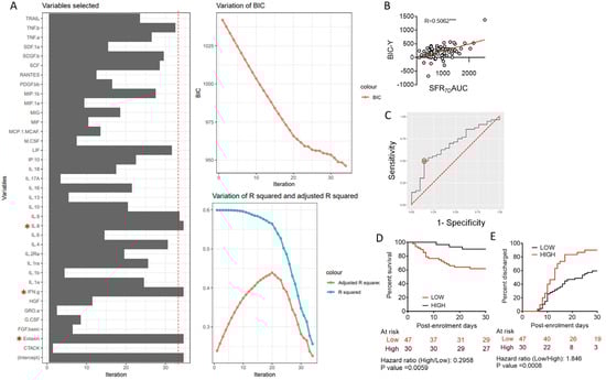 Machine learning to derive a minimal predictive model to describe blood oxygenation using plasma cytokine abundance in severe COVID-19 patients. (A) Bayesian information criterion applied to multiple regression model to derive SFR7dAUC based on plasma concentration of cytokines at time-point 1 (day of recruitment). The minimization of BIC value and evolution of R2 values are shown in the right panel with elimination of cytokines to derive a minimally effective model. Red * indicates the cytokines derived from the analysis. (B) Correlation of the three cytokine BIC-Y index with actual SFR7dAUC values in severe COVID-19 patients. Pearson’s R-value is shown, *** p < 0.0005. (C) Receiver operator characteristic curve (black line) of BIC-Y values to derive remission versus non-remission (death); the marked point denotes the specificity and sensitivity with the derived cut-off. (D) Survival of patients until day 30 post-enrolment is compared in a Kaplan–Meier curve between patients with BIC-Y values above (black line) or below (red line) the cut-off derived from the ROC curve shown in (C). Surviving patients were censored on day 30 post-enrolment. (E) Hospital stay duration (time to remission) of the patients from both groups (BIC-Y values above or below cut-off) since the day of enrolment are plotted in an ascending Kaplan–Meier curve. Deaths and non-remission at day 30 post-enrolment were censored. For the outcome comparisons shown in (D,E), the Mantel–Cox log-rank test was performed. The number of patients at risk on different days and the Mantel–Haenszel hazard ratio is shown.