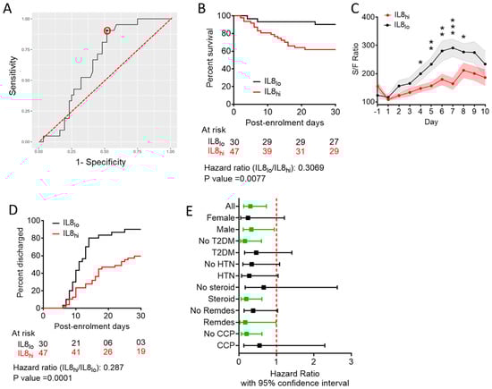 Plasma level of IL-8 and clinical outcomes in severe COVID-19 patients. (A) Receiver operator characteristic curve (black line) of plasma levels of IL-8 to derive remission versus non-remission (death), the marked point denotes the specificity and sensitivity with the derived cut-off (red circle). The red dotted line denotes the diagonal. (B) Survival of patients till day 30 post-enrolment is compared in a Kaplan–Meier curve between patients with plasma level of IL-8 below (IL8lo, black line) or above (IL8hi, red line) the cut-off derived from the ROC curve shown in (A). Surviving patients were censored on day 30 post-enrolment. (C) Comparison of SpO2/FiO2 ratio kinetics over 7 days following plasma sampling between IL8lo (black line) and IL8hi (red line) subgroup of patients. * p < 0.05, ** p < 0.005, *** p < 0.0005 from unpaired t-tests. (D) Hospital stay duration (time to remission) of the patients from both groups, IL8lo (black line) and IL8hi (red line), since the day of enrolment is plotted in an ascending Kaplan–Meier curve. Deaths and non-remission at day 30 post-enrolment were censored. For the outcome comparisons shown in (B,D) Mantel–Cox log-rank test was performed. Number of patients at risk on different days and the Mantel–Haenszel hazard ratio is shown. (E) Mantel–Haenszel hazard ratio for Kaplan–Meier analysis for survival in subgroups of patients, for IL8lo patients, compared with IL8hi patients. Analyses showing Mantel–Cox log-rank test p-values <0.05 are indicated in green.