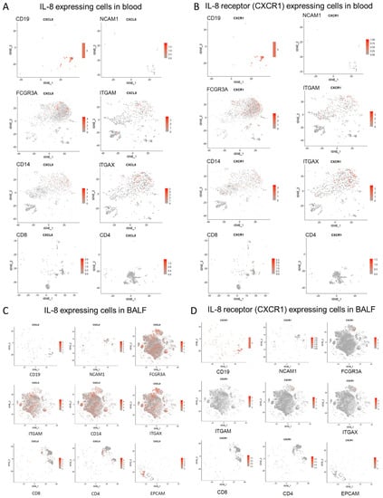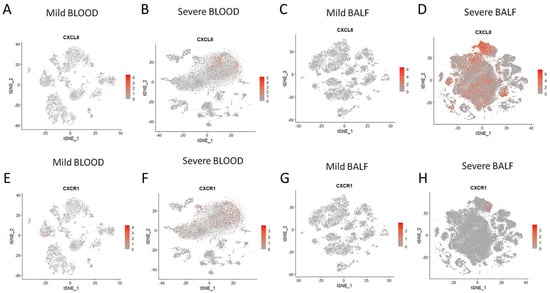 To glean further insight into cellular sources of IL-8 and the IL-8 responder cells in severe COVID-19 patients, we conducted a series of targeted re-analyses of two publicly available single-cell RNA sequencing datasets, GSE163668 (blood mononuclear cells) and GSE145926 (cells derived from bronchoalveolar lavage), generated from COVID-19 patients [11,29]. As expected from our present data as well as from previously reported data [30], significantly increased expression of both CXCL8 (gene encoding IL8) and its receptor CXCR1 was apparent in both peripheral immune cells as well as cells in bronchoalveolar lavage fluid (BALF) in severe COVID-19, as compared to cells derived from COVID-19 patients with milder disease course (Figure 4A–H). Expression of the other IL-8 receptor CXCR2 was insignificant and, thus, not considered for analyses.